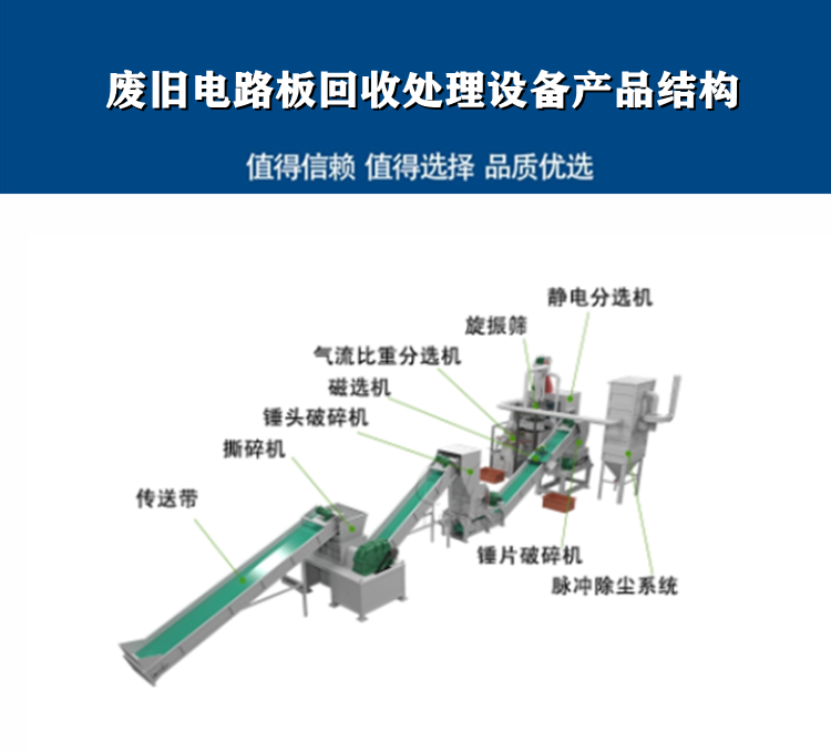 廢舊電路板回收處理設(shè)備破碎分離廢電子電路板回收金屬資源工藝:拆解-輸送-破碎-粉碎-改進(jìn)振動(dòng)系統(tǒng)-篩選-分選-除塵,工藝成熟,環(huán)保達(dá)標(biāo);金屬固體廢料、剪切破碎機(jī)、錘式破碎機(jī);破碎混合物進(jìn)入旋風(fēng)分級(jí)機(jī),非金屬粉塵進(jìn)入袋式除塵器;大于60目的材料粉末進(jìn)入振動(dòng)篩,通過振動(dòng)篩選出;60目、40目、20目、10目的物料;10目以內(nèi)的物料送至可調(diào)速錘式破碎機(jī)進(jìn)行二次破碎;20目以下的物料送至高壓靜電分揀機(jī),金屬和非金屬粉末通過多個(gè)固定在中軸上的除塵板旋轉(zhuǎn)分離;分離后的金屬粉末通過電解生產(chǎn)線實(shí)現(xiàn)各種金屬的高純度分離。